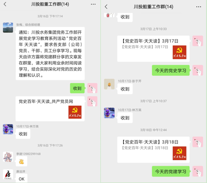 四川川投船重環境科技有限公司響應國家及川投集團、川投水務集團關于開展黨史學習教育系列活動的具體要求,從3月16日開始,利用微信每日組織公司全體人員學黨史、用黨史。