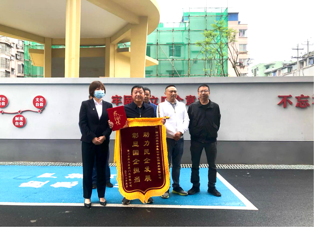 5月18日下午,四川圣締大自然門業有限公司來到中江水司,將一封感謝信和一面印有“助力民企發展 彰顯國企擔當”的錦旗送到黨支部書記、董事長、總經理朱禹手中,以表達對中江水司解決其用水困難的高度贊揚和誠摯謝意。