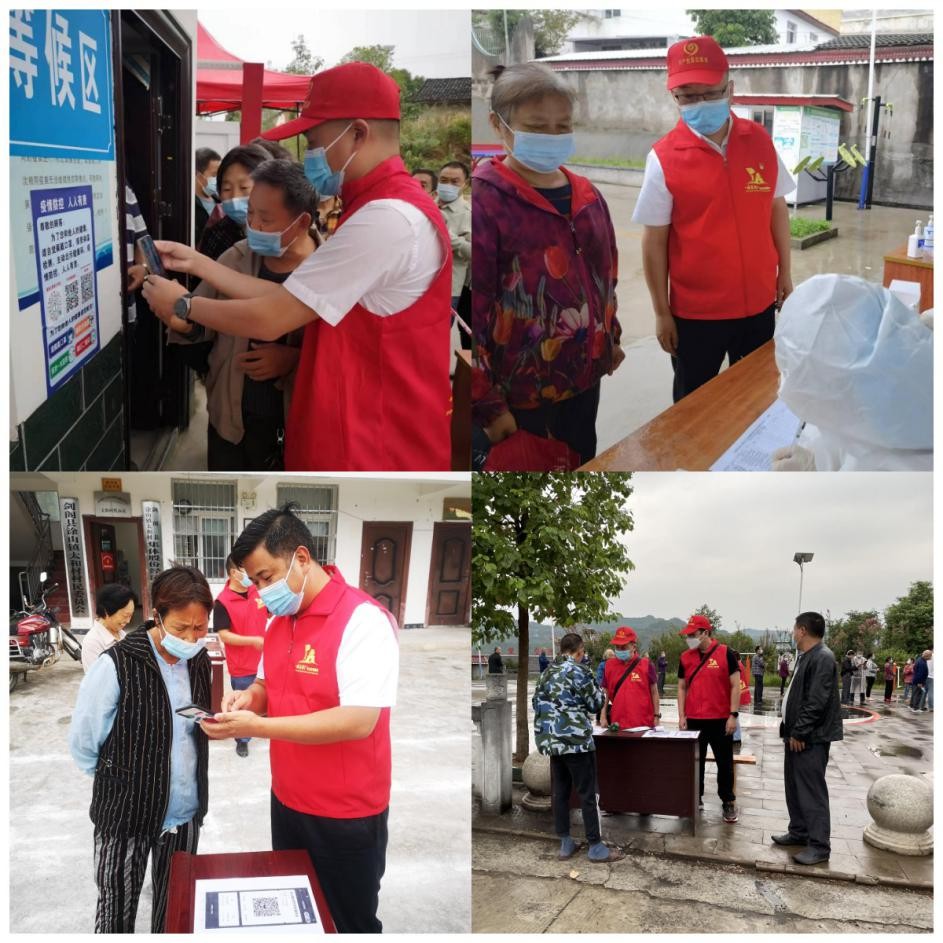 隨著人流量不斷增加,隊(duì)員們又主動(dòng)承擔(dān)起維持秩序、引導(dǎo)掃碼測(cè)溫等工作。“請(qǐng)您帶好口罩,出示行程碼,掃場(chǎng)所碼!”由于農(nóng)村地區(qū)老年人居多,對(duì)核酸檢測(cè)程序不了解,隊(duì)員們不厭其煩地一遍又一遍地重復(fù)著引導(dǎo)語。有的老年人沒有智能手機(jī)或者不會(huì)使用,他們又主動(dòng)幫助其核實(shí)身份信息、綁定“天府健康通”APP等等,讓采樣過程更加流暢,效率大大提高。經(jīng)過一天的努力,涂山鎮(zhèn)全域全員核酸采樣完成,無一人漏檢。