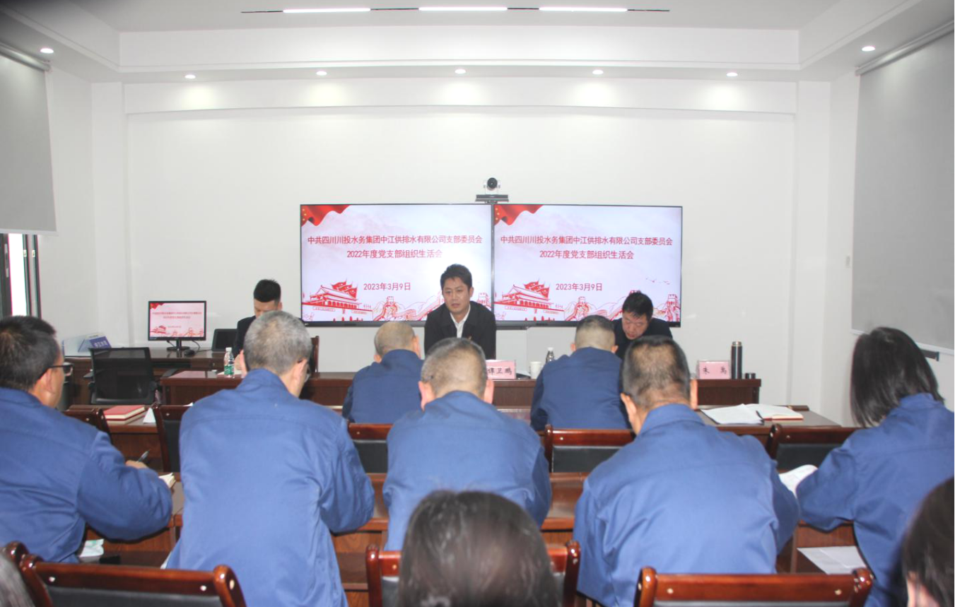 2023年3月9日,中江水司黨支部組織召開2022年度組織生活會暨民主評議黨員大會,會議由黨支部書記朱禹主持,支部16名黨員同志參加會議。川投水務集團副總經理譚衛鵬率黨群紀檢部工作人員進行了現場督導。