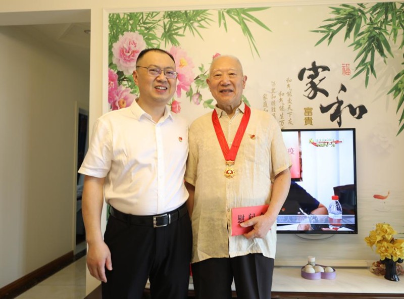 在老黨員劉大榮家里,李旭東關切地詢問了劉老和老伴的身體狀況及生活現狀,親手為劉大榮同志佩戴上由中共中央頒發的“光榮在黨50年”紀念章并送上慰問金,祝福老人家身體安康、健康長壽。80多歲高齡的老黨員劉大榮精神抖擻,他用樸素的話語表達了自己的感激之情:“感謝黨的恩情,感謝集團對我們的關懷!”
