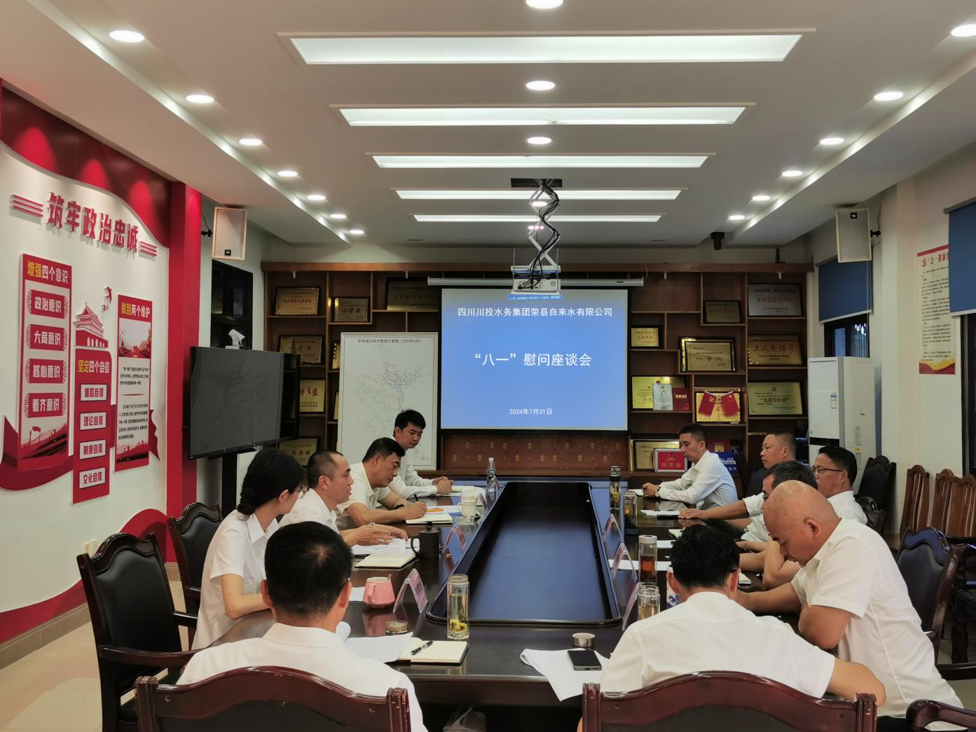 為慶祝中國(guó)人民解放軍建軍97周年,弘揚(yáng)擁軍優(yōu)屬的優(yōu)良傳統(tǒng),增進(jìn)軍民魚(yú)水情,榮縣水司于2024年7月31日下午在公司底樓會(huì)議室召開(kāi)了“八一”慰問(wèn)座談會(huì)。劍閣水司黨支部書(shū)記、執(zhí)行董事、總經(jīng)理龔慶主持會(huì)議,17名退役軍人職工參加了此次會(huì)議。