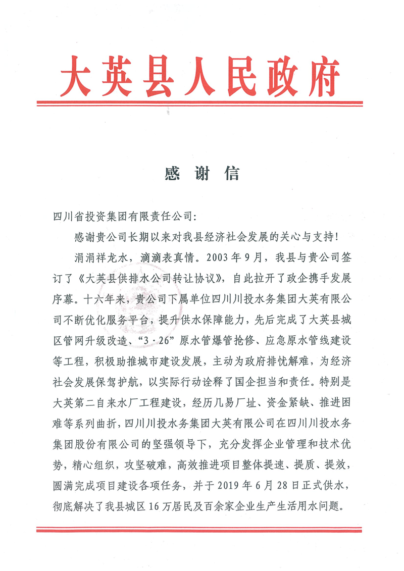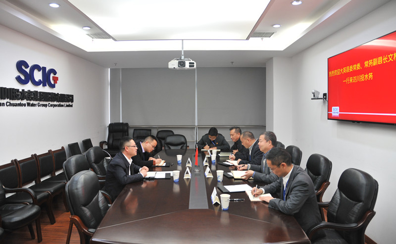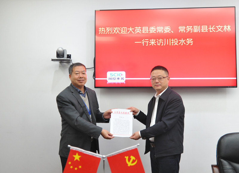 2019年11月19日,大英縣委常委、縣人民政府常務副縣長文林來訪川投水務,并代表大英縣人民政府向川投集團、川投水務送來感謝信。川投水務黨委書記、董事長梁有國,黨委副書記、總經理鄧銳在川投大廈24樓會議室會見文副縣長一行。