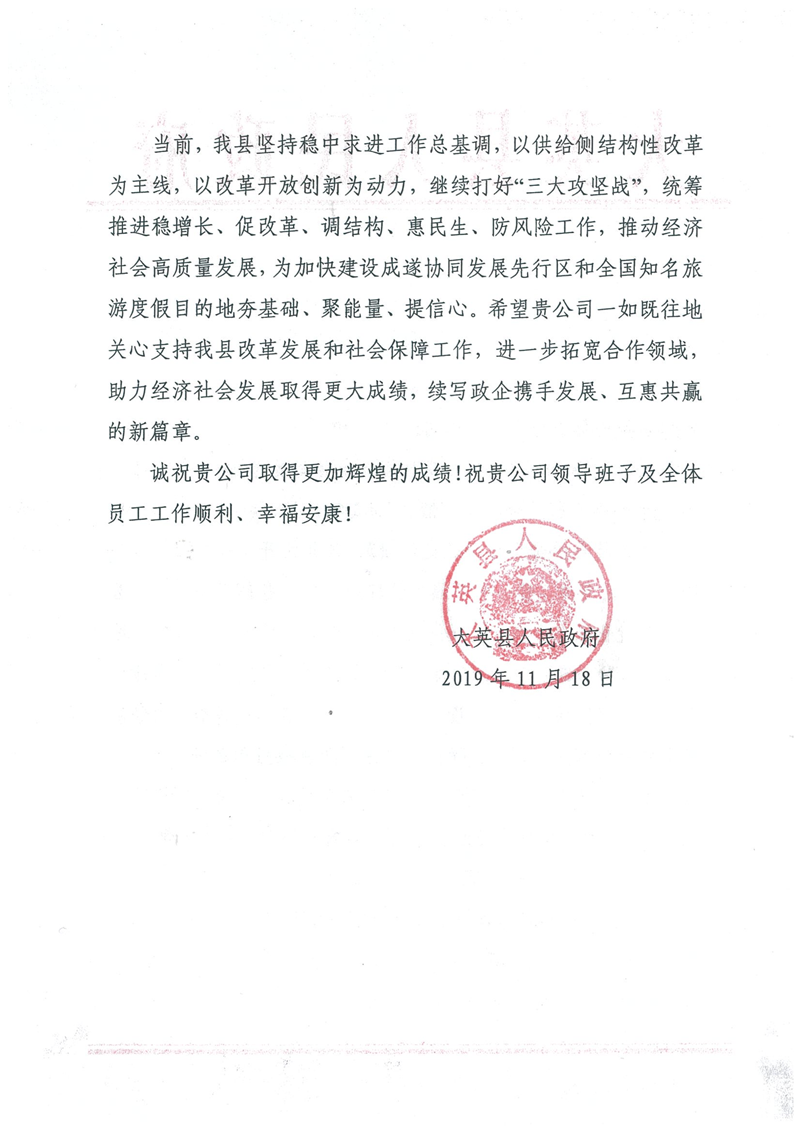 會見期間,文副縣長親手將感謝信送到了梁董事長手中并合影留念。大英縣機關事務保障中心副主任蔣長壽,川投水務黨委委員、紀委書記但必良,總經理助理、大英水司總經理劉松果參加了會見。
