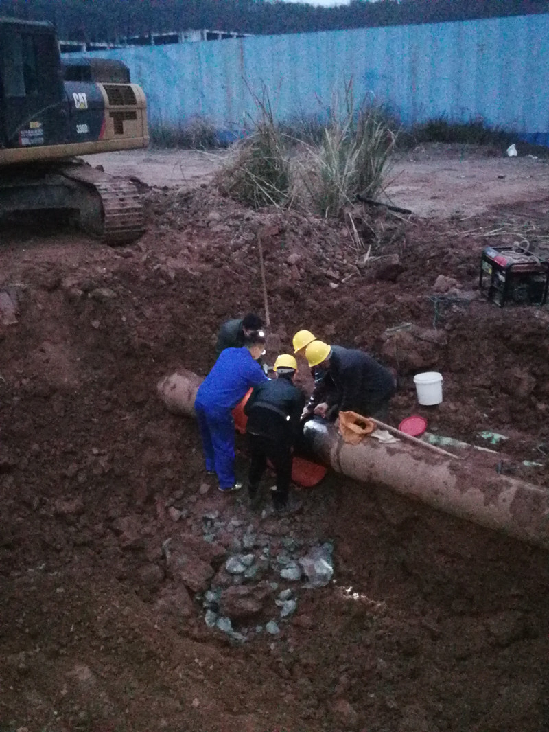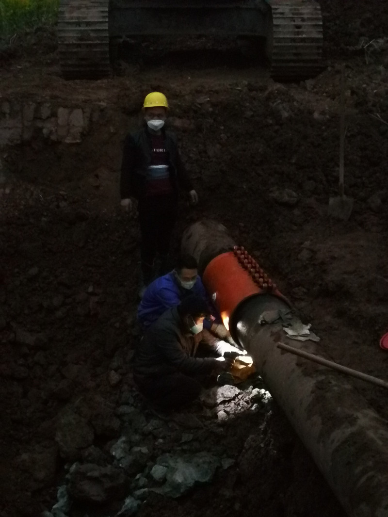 查清現(xiàn)場(chǎng)情況后,公司第一時(shí)間向分管副縣長(zhǎng)和相關(guān)部門作了匯報(bào)。為了在最短時(shí)間內(nèi)恢復(fù)供水,搶修人員現(xiàn)場(chǎng)商量最佳搶修方案,并立即關(guān)閉閥門、排水,作業(yè)面開挖,調(diào)度搶修器材。綜合部也第一時(shí)間發(fā)布臨時(shí)停水通知,讓停水區(qū)域居民了解實(shí)情,知曉搶修進(jìn)度。公司總經(jīng)理劉松果和副總經(jīng)理王洪先始終堅(jiān)守在搶修一線,親臨指揮。搶修人員戴著口罩跳入土坑奮力搶修,大家相互配合默契,有的在地面往下傳遞工具,維修人員則擼起雙袖,貓著腰將管道的“傷口”處理干凈,整個(gè)搶修工作有條不紊。經(jīng)過3個(gè)小時(shí)奮力搶修,修復(fù)了受損管道,晚上20時(shí)許,恢復(fù)正常供水。
