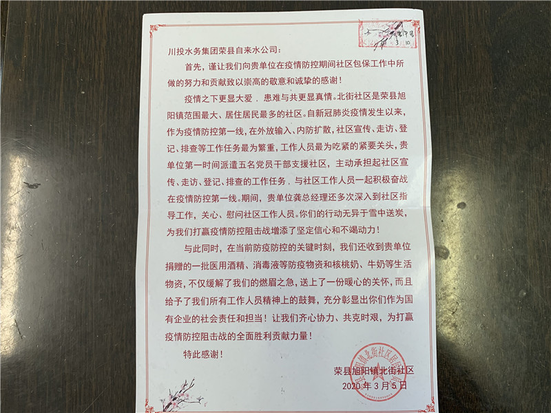 急群眾之所急,想群眾之所想。這一面錦旗和一封感謝信不僅代表著北街社區對公司所做工作的充分肯定和認可,更彰顯了作為供水企業的社會責任和擔當,樹立了良好的社會形象。疫情當前,榮縣水司定當會繼續落實疫情防控工作和生產經營工作舉措,同心協力、共克時艱,全力做好疫情防控和安全穩定供水工作!