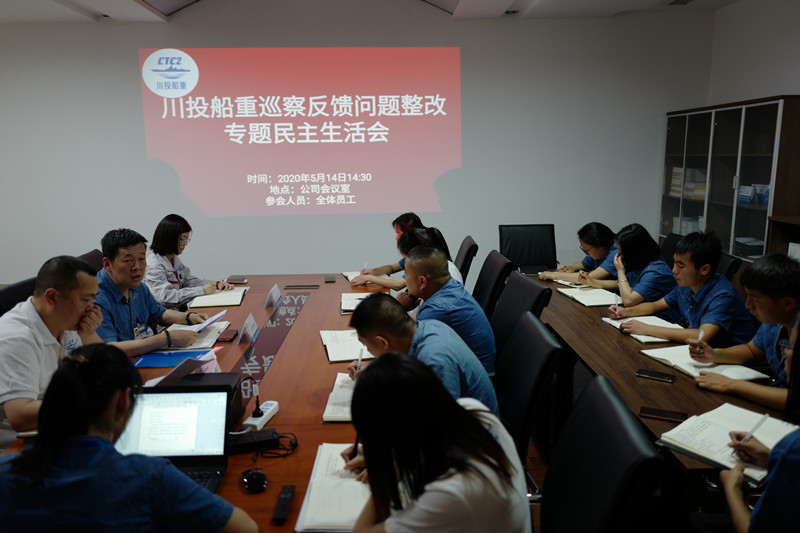 根據省國資委第二巡察組要求,按照川投水務集團黨委《關于落實省國資委第二巡察組巡察反饋意見的整改方案》,四川川投船重環境科技有限公司于2020年5月14日召開巡察反饋問題整改專題民主生活會,會議由總經理馬銘偉主持,全體員工參加會議。