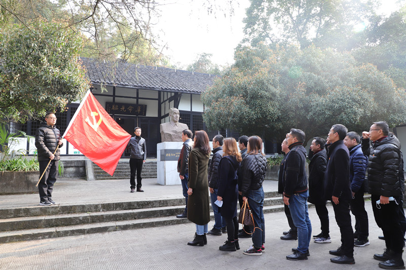 隨后,在吳玉章紀念碑前,全體黨員面對黨旗重溫入黨誓詞:“我志愿加入中國共產黨,擁護黨的綱領……”以錚錚誓言再次做出共產黨員的鄭重承諾。