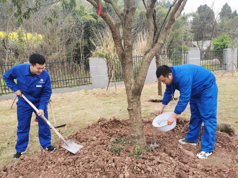 挖坑、栽樹、填土、澆水,員工們態(tài)度積極,熱情高潮,大家齊心協(xié)力,密切配合,干得熱火朝天。一番辛勤忙碌后,一排排樹木筆直矗立,在溫暖的春日下迎風招展,生機勃勃。
