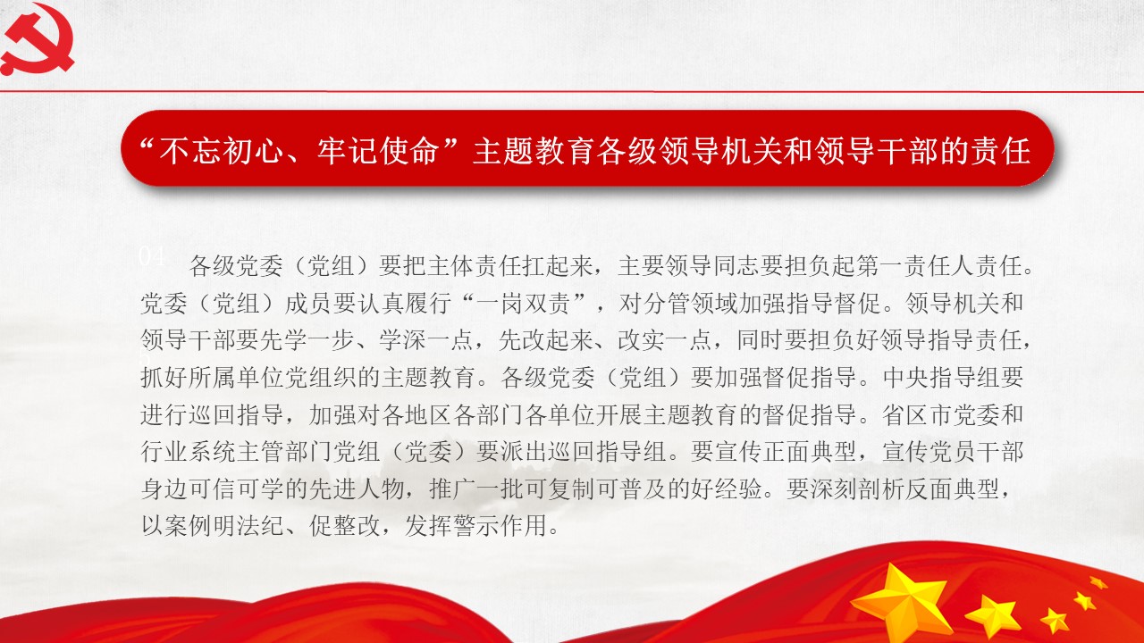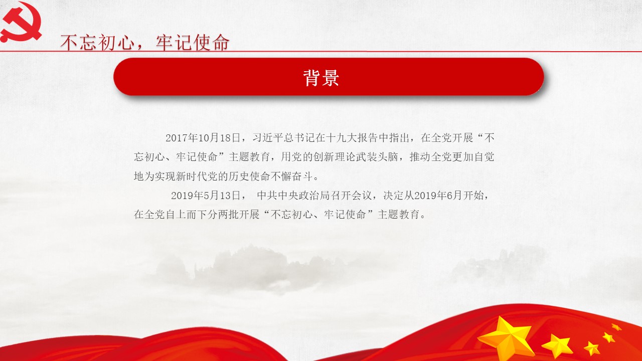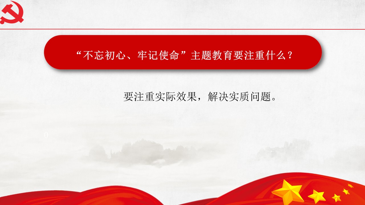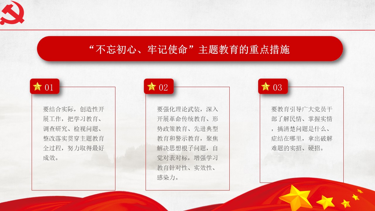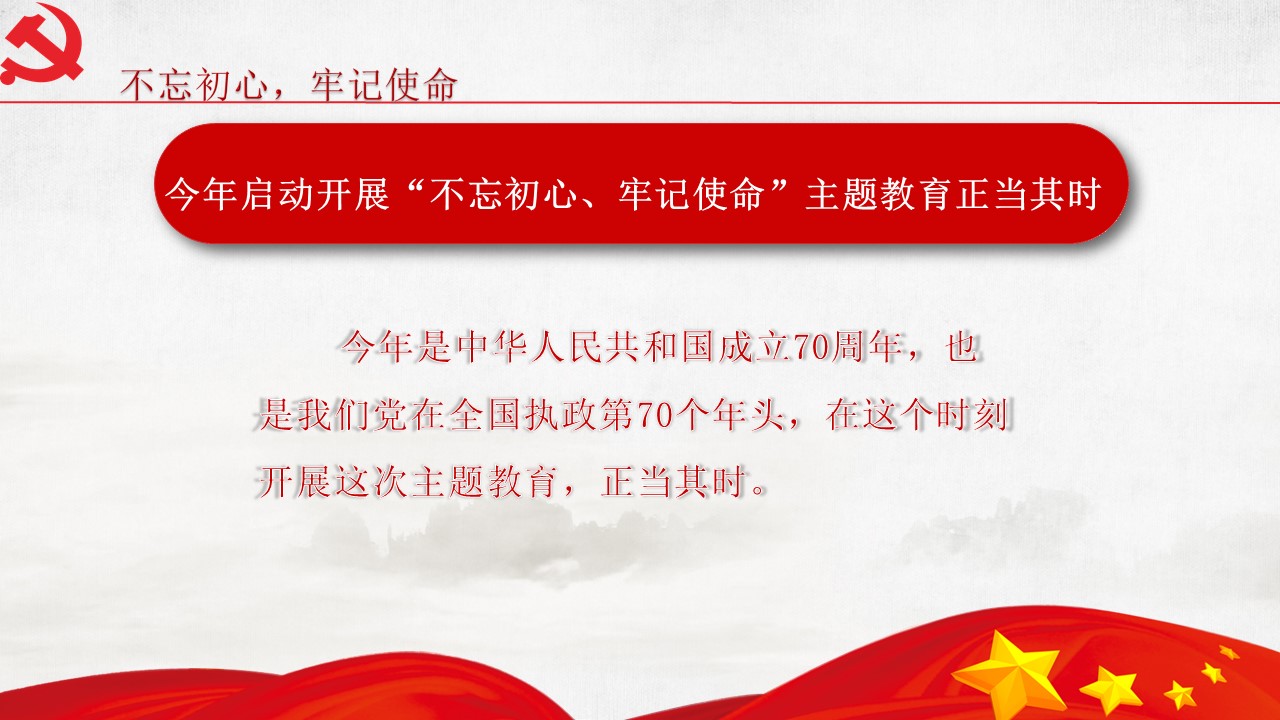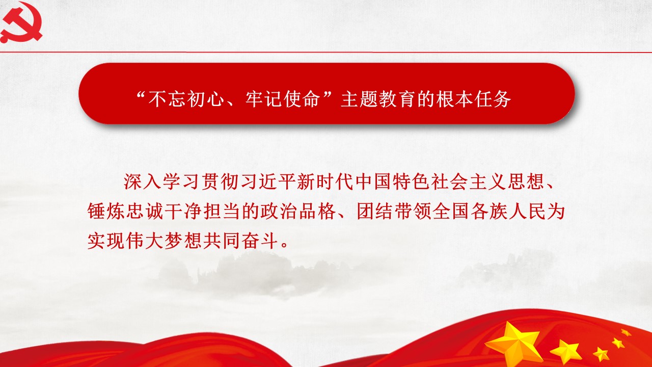 5月31日“不忘初心、牢記使命”主題教育工作會議31日在北京召開。中共中央總書記、國家主席、中央軍委主席習近平出席會議并發表重要講話。他強調,為中國人民謀幸福,為中華民族謀復興,是中國共產黨人的初心和使命,是激勵一代代中國共產黨人前赴后繼、英勇奮斗的根本動力。開展“不忘初心、牢記使命”主題教育,要牢牢把握守初心、擔使命,找差距、抓落實的總要求,牢牢把握深入學習貫徹新時代中國特色社會主義思想、...